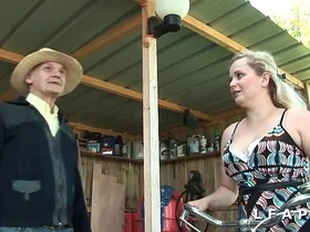 Cute little slut with big tits and a big ass who got into a threesome with her grandfather